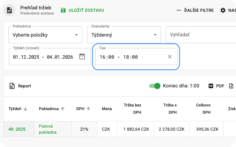 Chcete vedieť, ako sa darí vašim obedovým špičkám alebo večerným akciám? V zostavách je nový filter Časové rozmedzie. Jednoducho tak zistíte napríklad tržby za posledný štvrťrok v čase medzi 11:00 a 13:00.