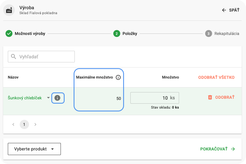 Do 2. a 3. kroku sme pridali stĺpec Maximálne množstvo, ktorý stráži vaše skladové limity. A cez informačné tlačidlo si môžete zobraziť rozpad receptúry vyrábaného produktu.