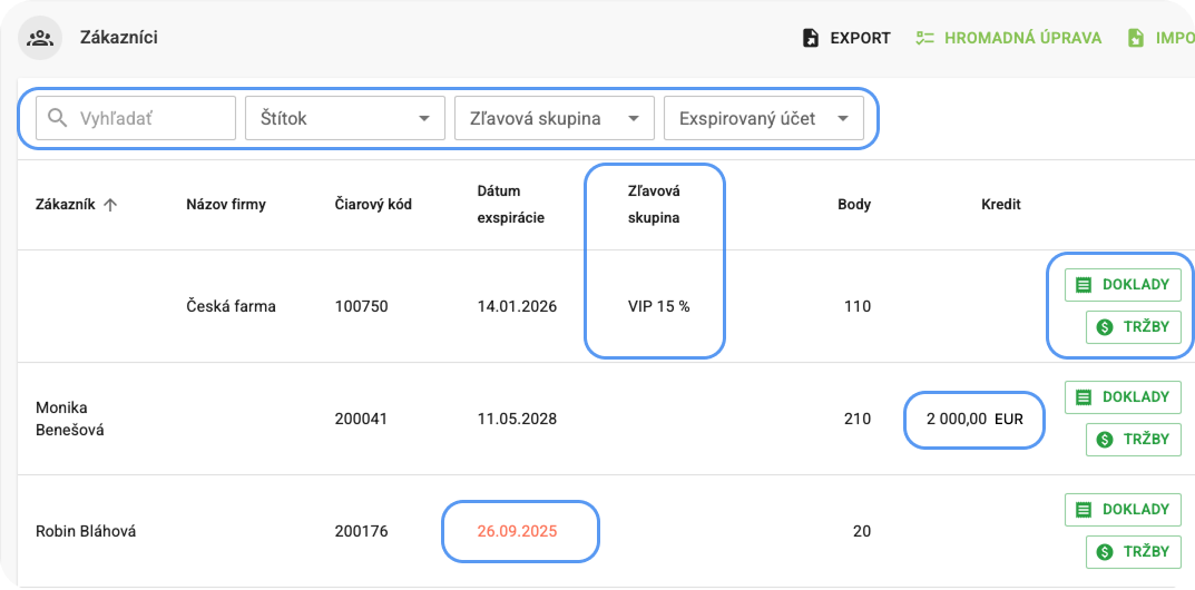 Po novom môžete zákazníkov filtrovať podľa expirácie účtu, štítkov a zľavovej skupiny. Vyhľadávať možno podľa mena a priezviska, firmy, IČO alebo DIČ a tiež podľa čiarového kódu. V zozname tiež na prvý pohľad uvidíte zľavovú skupinu, kredit a podľa červenej farby spoznáte expirovaný účet. Cez tlačidlo doklady alebo tržby sa prekliknete do zostáv dokladov alebo tržieb daného zákazníka.