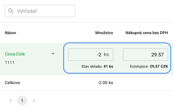 Tip: Pri zadaní záporného množstva (opravné naskladnenie) sa do nákupnej ceny bez DPH automaticky doplní priemerná nákupná cena.