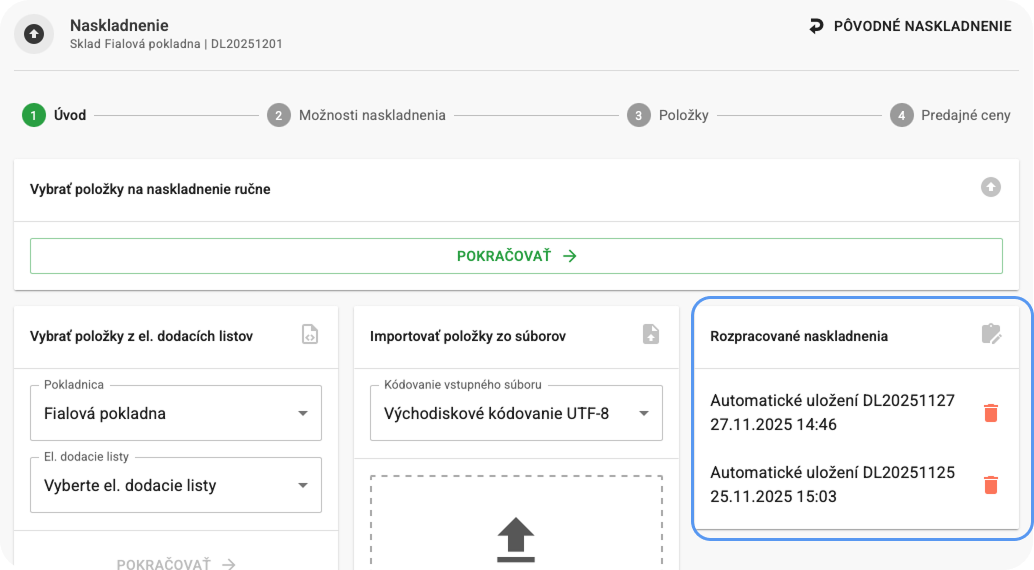 Istota je istota. Pridali sme funkciu automatického ukladania naskladnenia. Či už z neho odídete omylom, alebo úmyselne, vaša práca na vás počká v sekcii Rozpracované naskladnenie.