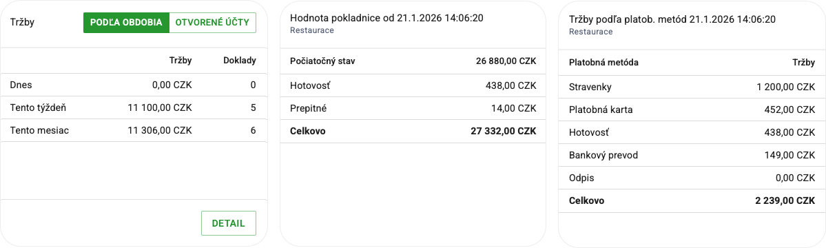 - Tržby podľa platobných metód: Rozpis tržieb podľa spôsobu platby (hotovosť / karta / iné metódy).
