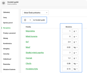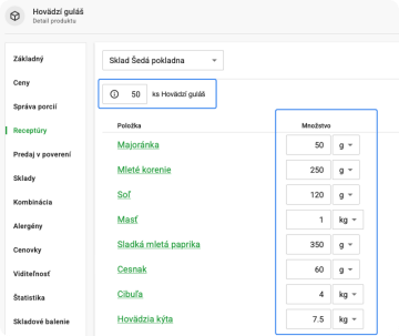 Do produktu s receptúrou vyplňte do nového poľa počet porcií a do receptúry zadajte množstvo ingrediencií z receptu. Napr. v receptúre na 50 porcií guláša potrebujete: 7,5 kg hovädzieho mäsa, 4 kg cibule, 1 kg masti... atď.
