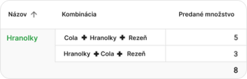 Používate kombinácie? A viete, koľko hranoliek ste predali v akej kombinácii? Zistíte to v novej zostave Predané produkty vrátane kombinácií. Ukáže vám, ako sa jednotlivé varianty predávajú – napríklad 3× Rezeň + Hranolky + Cola a 5× Rezeň + Hranolky + Pivo. Ľahko tak zistíte, čo u vás letí, a ponuku podľa toho prispôsobíte.